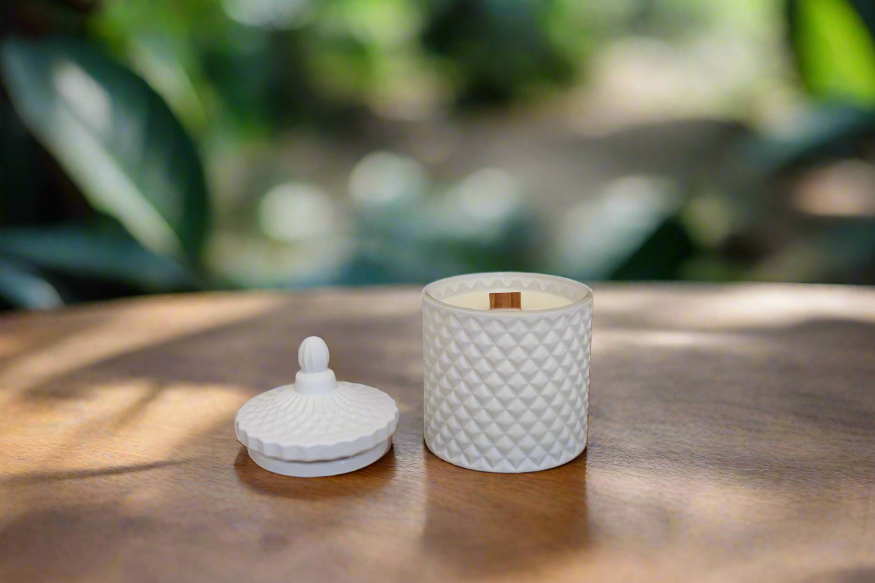 This non-toxic, soy-coconut 10oz candle is a perfect blend of elegance and sophistication, housed in a white matte textured vessel. The subtle, tactile texture adds depth and interest to its sleek, minimalist design, making it a beautiful decorative piece for any room. Its soft, matte finish exudes a refined, modern aesthetic, while the textured surface catches the light in an alluring way. Ideal for creating a calming and inviting atmosphere, this candle’s understated elegance enhances any space, whether placed on a mantel, table, or shelf. With its delicate yet stylish appearance, this candle is both a functional and decorative accent for your home.